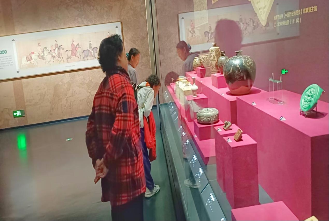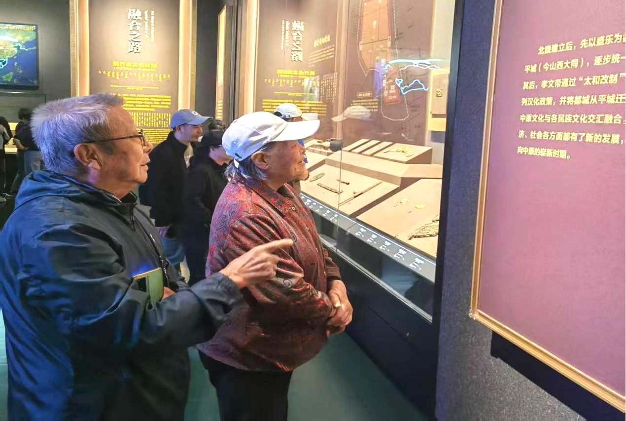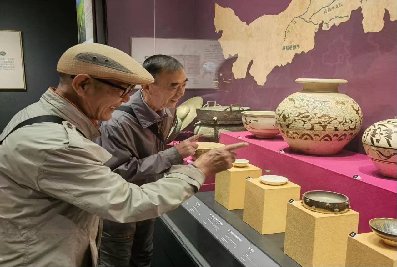 三层的专题展览同样精彩纷呈。在“融铸北疆 —— 内蒙古古代历史陈列”展厅,从大窑遗址的远古微光到红山文化的玉龙初现,从胡服骑射的革新魄力到昭君出塞的和亲大义,文物背后的历史故事引发老同志们的热烈讨论,他们不禁感慨道:“这些文物见证了各民族交融共生的历程,这正是中华文明多元一体的生动写照。”展厅内的元代金属编织戏台、长城贸易微缩场景等复原景观,让老同志们直观感受着北疆大地的历史积淀。