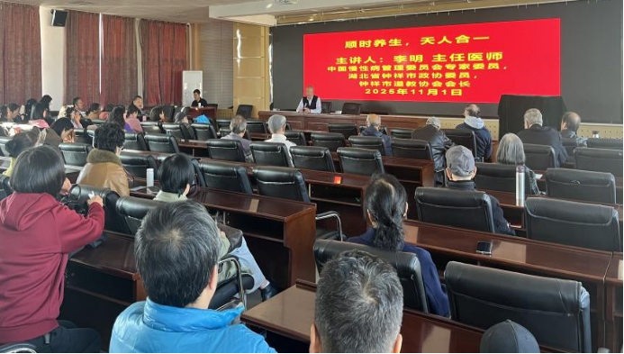 11月1日上午,学校离退休人员工作处五楼会议室座无虚席。兼具主治医师、中国慢性病管理委员会专家委员、湖北省钟祥市政协委员、钟祥市道教协会会长四重身份的李明先生,受邀为校老教授协会会员开展“顺时养生,天人合一”主题讲座。针对老教授群体年龄特点与常见健康问题,他以“穴位养生、饮食养生、药物养生”为核心,拆解传统养生智慧的实践方法,结合四季更迭与人体节律的关系,深入浅出地阐释了“天人相应”的养生内核。